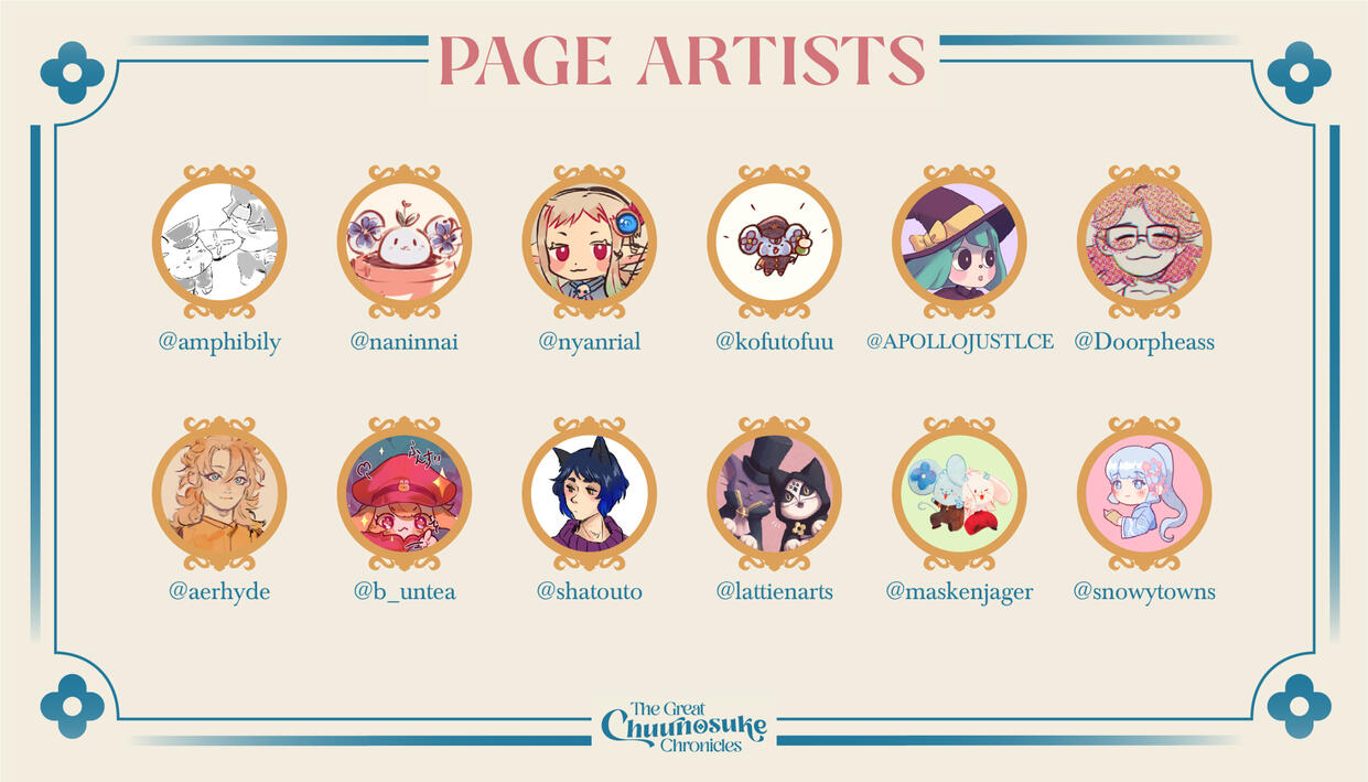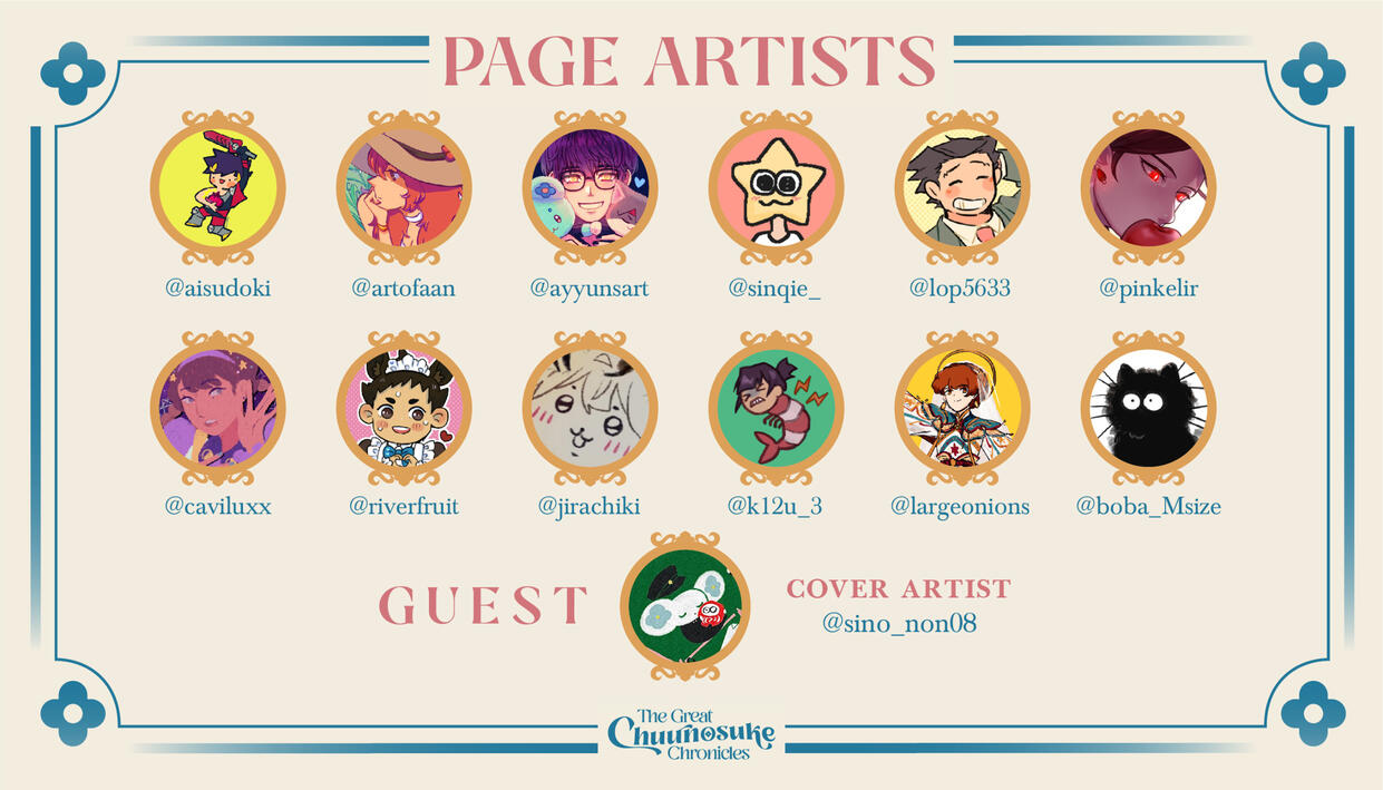 The Great Chuunosuke Chronicles is an unofficial The Great Ace Attorney zine featuring Chuunosuke's adventures with his friends and family, all drawn and written in their animal mascot form. The zine is mainly Chuunosuke-centered, so every art, fic, and merch will include him.